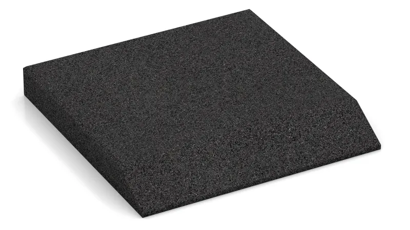 The edge tile with one chamfered side is a useful and system-compatible addition to the rubber granulate tiles type FS. The edge tile is used for avoiding trip hazard that can occur at the transition to the rubber granulate surface in case only one section is paved with rubber granulate slabs. It also helps compensate the level difference between the ground and rubber plates surface. Trip accidents can be avoided and smooth driving on it with a wheelchair, a baby buggy or a rollator is possible.