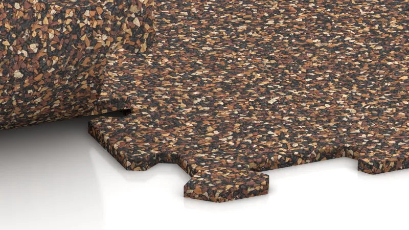 The tiles are produced by moulding oversized slabs from PU-bonded ELT rubber granulate. After a curing and cooling phase, these slabs are split in half to create thinner elements. The result is exceptionally thin fitness tiles with a typical rubber surface that appears almost closed, preventing dirt and moisture from penetrating.
