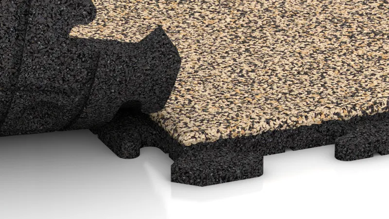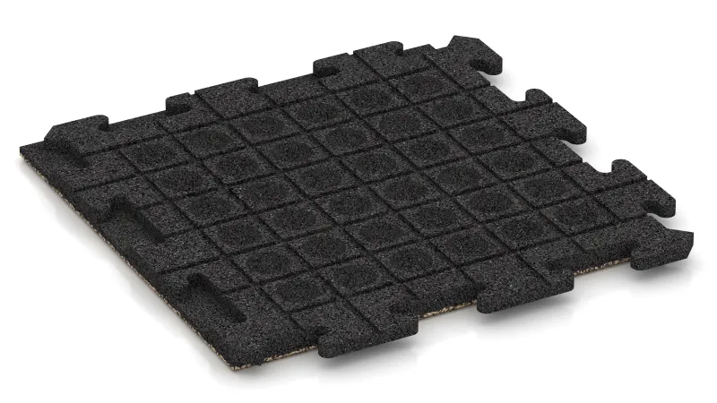 The tiles feature a concealed puzzle interlock. When installed, the teeth engage form-fit, creating a stable, permanent surface. Installation is done in a checkerboard layout (cross joint), producing an even, uniform and visually appealing area. No edge restraint is required. Tiles can be cut to size with a circular saw or a heavy-duty knife.