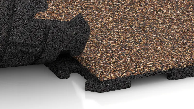 The playground flooring generates a pleasant, naturally warm ground feeling. It's well water-permeable, so that it doesn't seal the ground below and becomes quickly dry after a rainfall. The large-sized tiles can be laid quickly and in a stable way; in case of an unbounded ground, a base course made of plastic honeycomb grid is recommended.