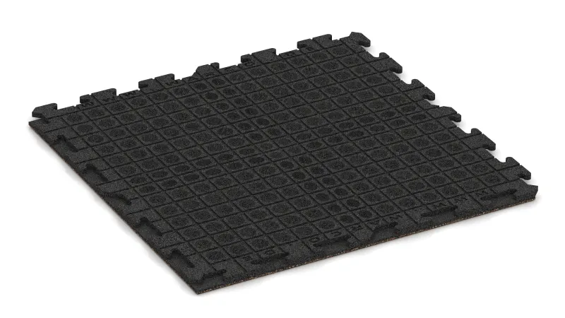 Two tile edges feature a positive locking profile, the other two a matching negative profile. When laid, the tiles interlock securely from below, forming a durable mechanical connection. From above, the surface appears seamless and aligned, typically with a clean, square joint pattern similar to a chessboard layout.