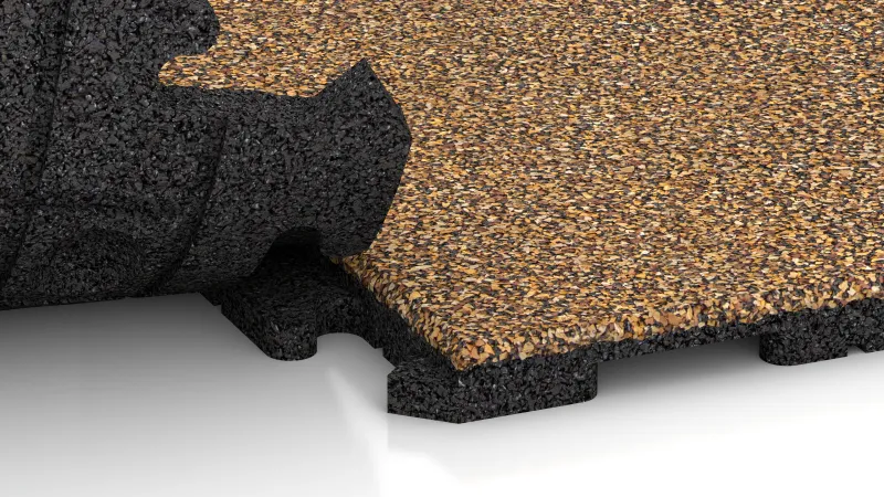 The playground flooring generates a pleasant, naturally warm ground feeling. It's well water-permeable, so that it doesn't seal the ground below and becomes quickly dry after a rainfall. The large-sized tiles can be laid quickly and in a stable way; in case of an unbounded ground, a base course made of plastic honeycomb grid is recommended.