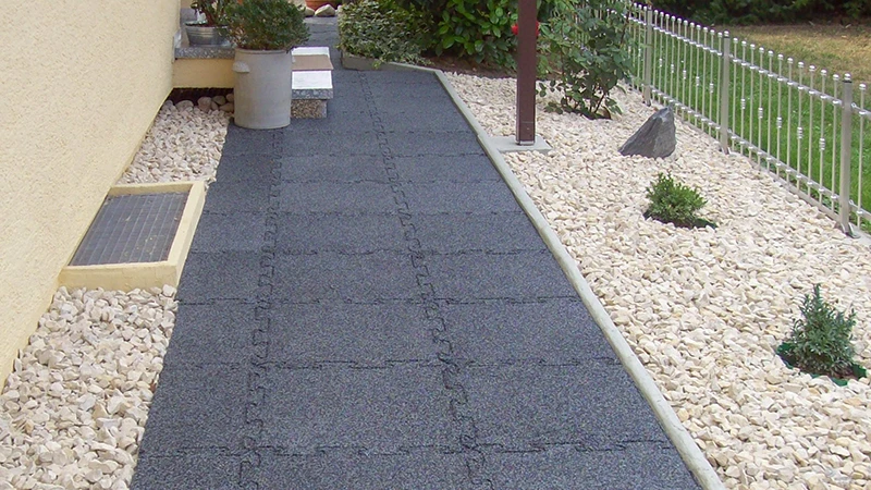 Rubber paving slabs can be laid quickly on any suitable surface. For individual stepping stones on the lawn, it is enough to remove the grass to the required depth, level the soil, add a little sand or gravel and place the slab. Thanks to their elasticity, the slabs also adapt to less than perfect ground.