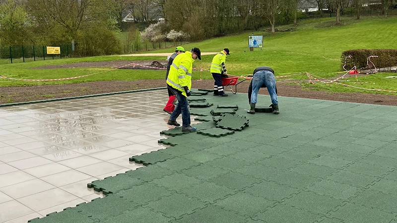 - For the tennis wall, the 30 mm thick ball playing mats pro (with higher density) are laid directly on a leveled and flat cinder field.