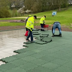 - A large soccer field or basketball court is laid on plastic honeycomb grids with or without frost protection, depending on the surface. Ball tiles with a thickness of 40 mm are used as the playing surface.