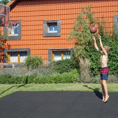 For a basketball hoop on the house wall or carport, simply lay 18 mm thick sports floor panels on the concrete interlocking pavement or driveway asphalt.